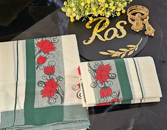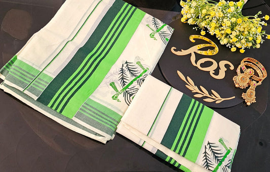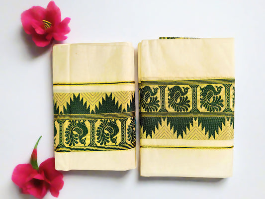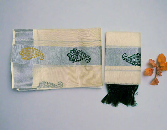 Settu Mundu with Ready made green silk blouse (fits up to 3xL)