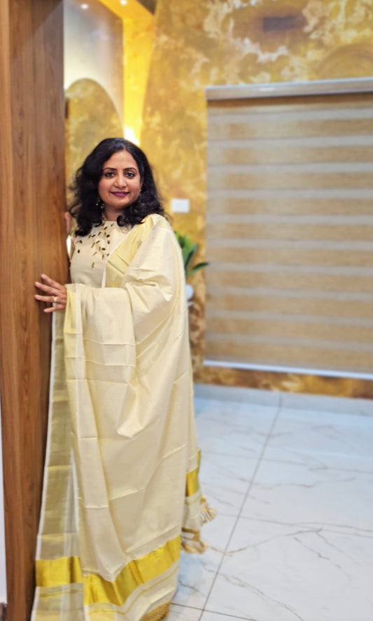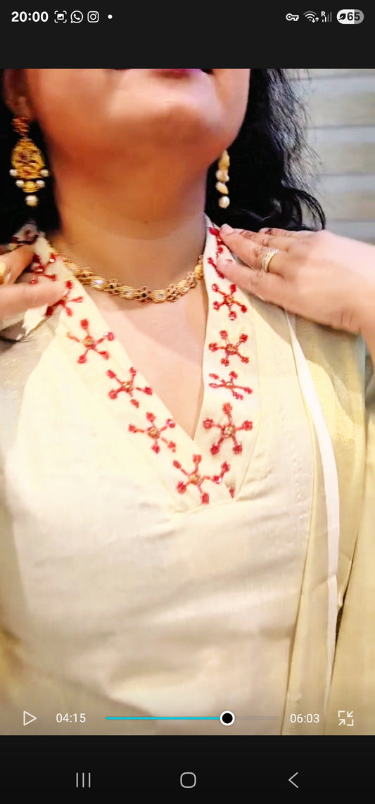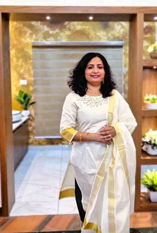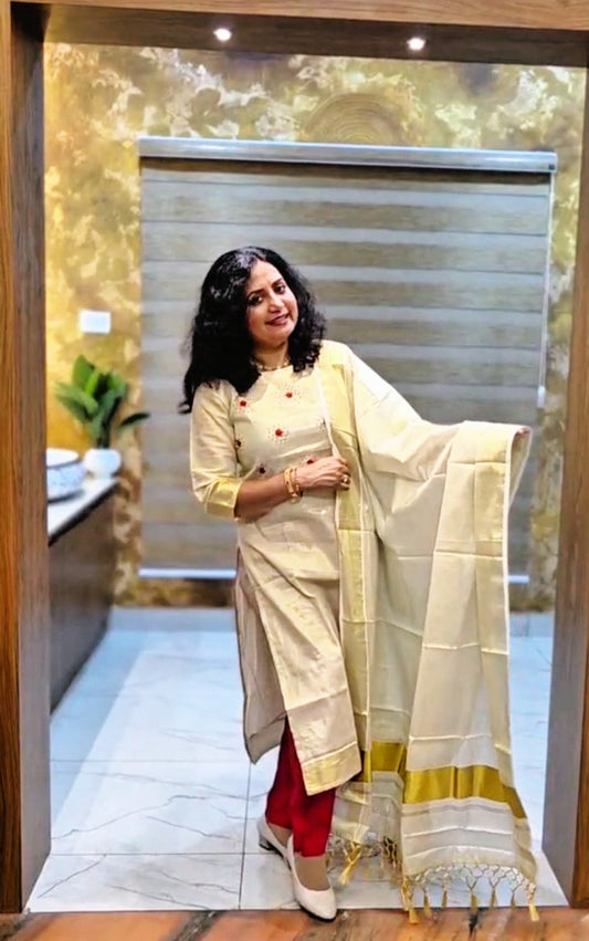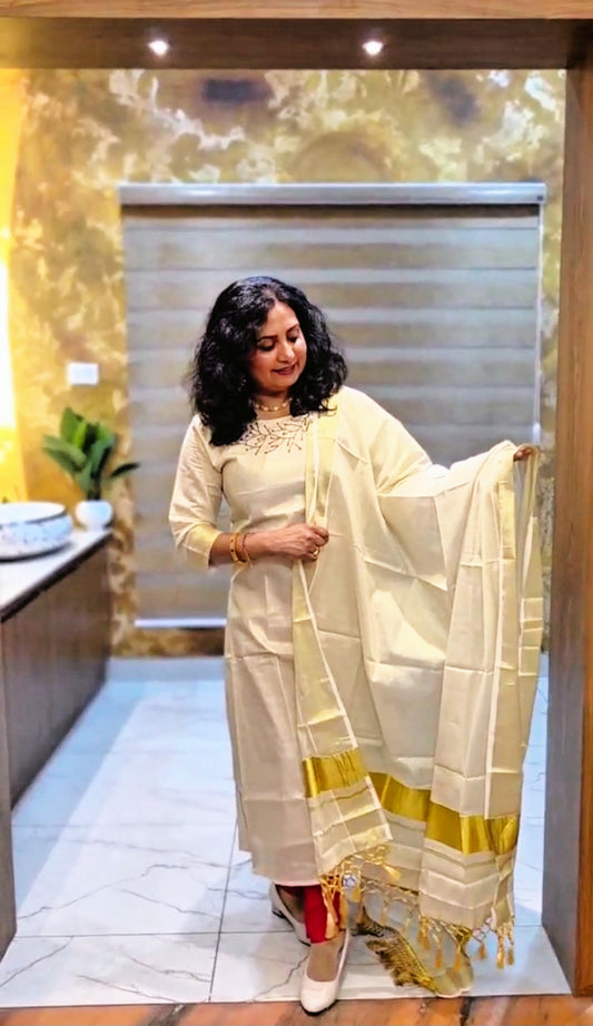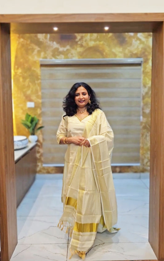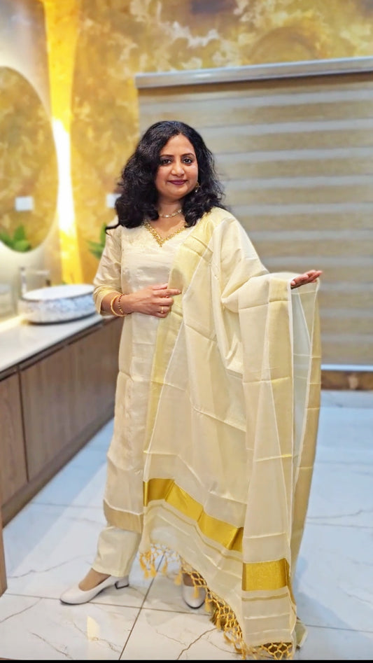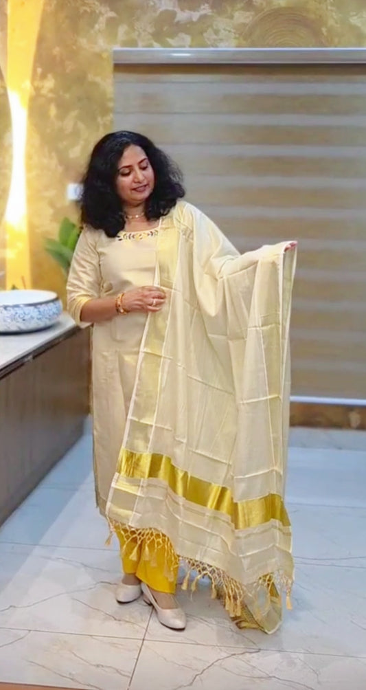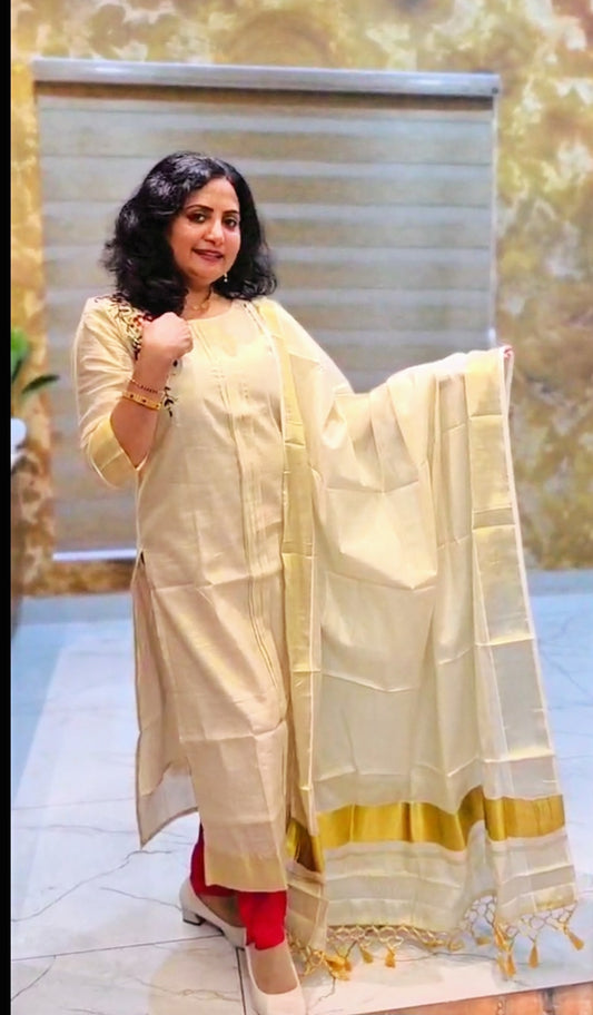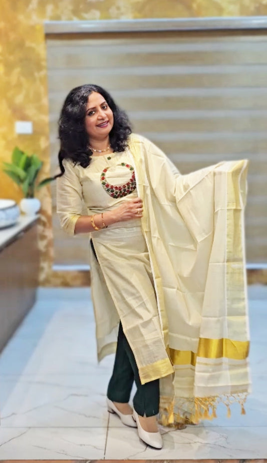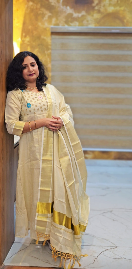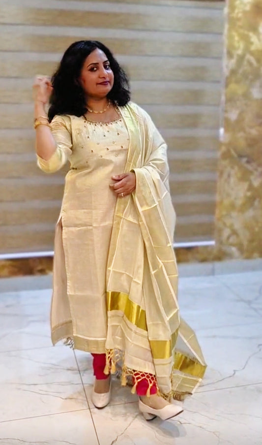 Beautiful hand worked Onam tissue three piece suit / ready to wear onam kurti set