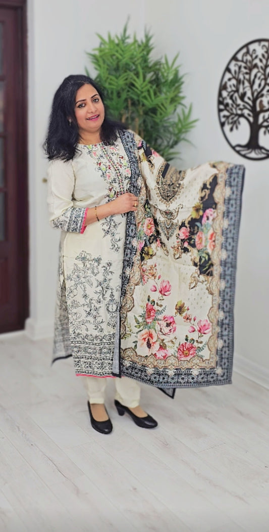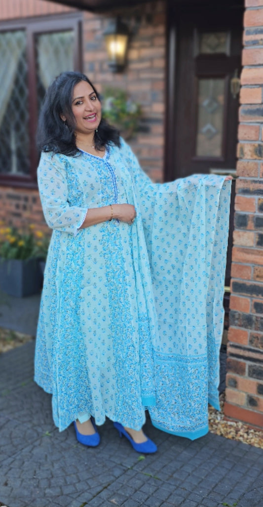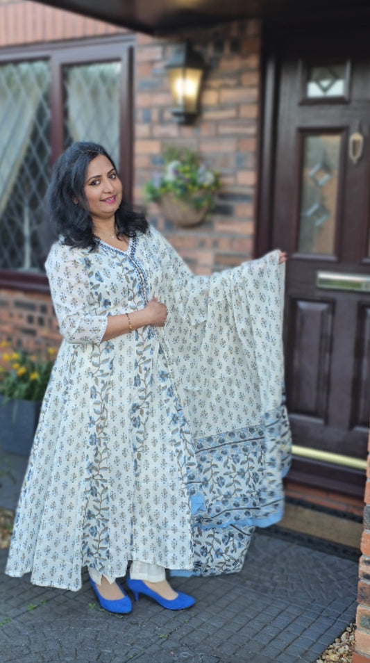 Floral printed Mulmul cotton panel cut Anarkali three piece suit (ready to wear)