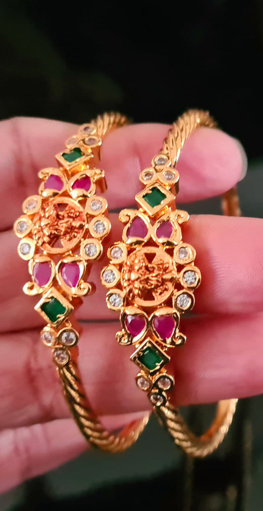 2 x Gold plated ruby and emerald antique kada / bangle