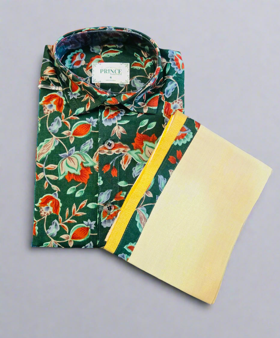 Celebrate Onam with this traditional boy’s shirt and mundu set, crafted to ensure comfort and cultural authenticity. The lightweight fabric keeps your child cool during the festivities, while the classic mundu design honors Kerala’s rich heritage. Perfectly tailored, this ensemble offers ease of movement and a polished look, making it ideal for Onam celebrations and family gatherings.