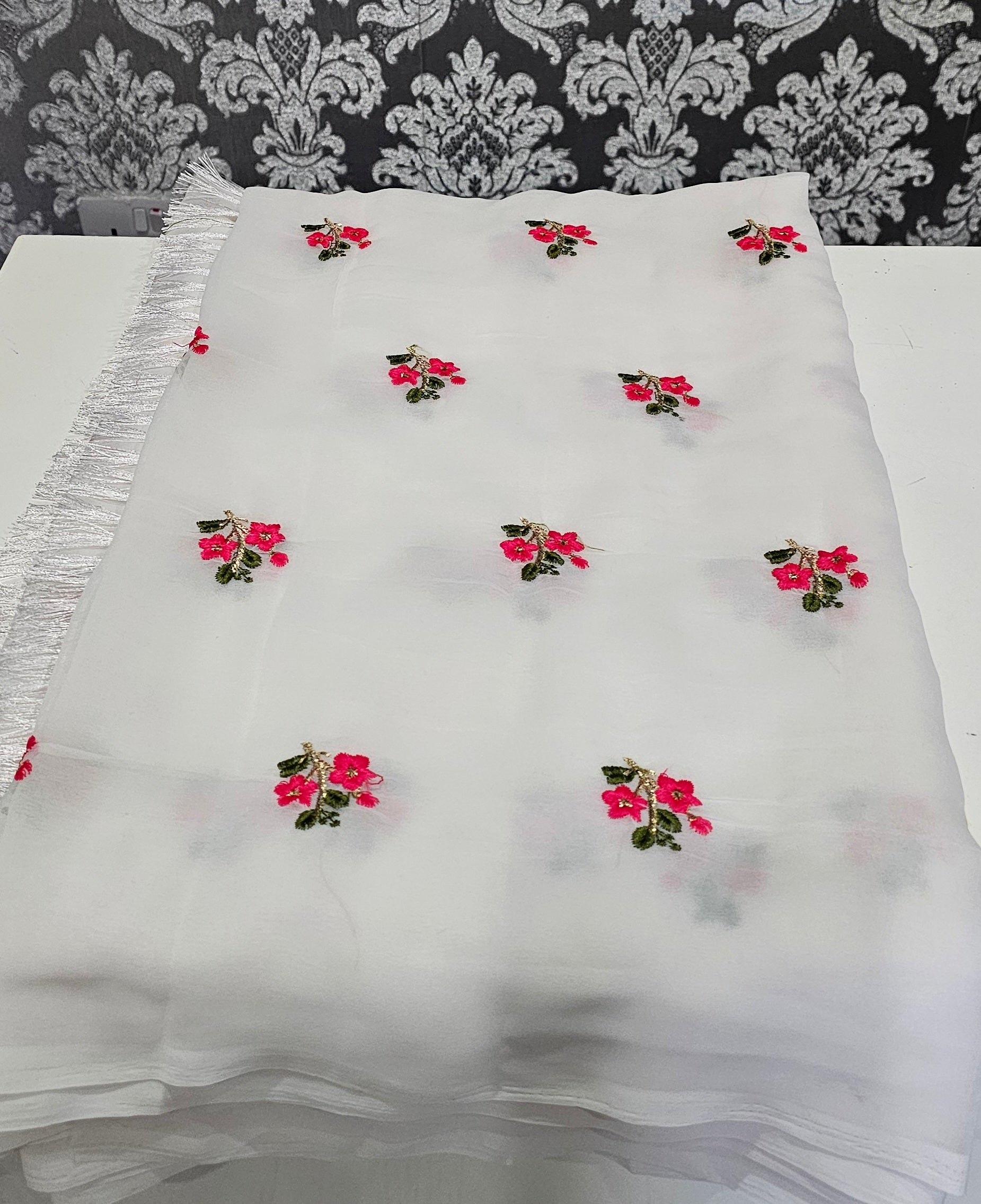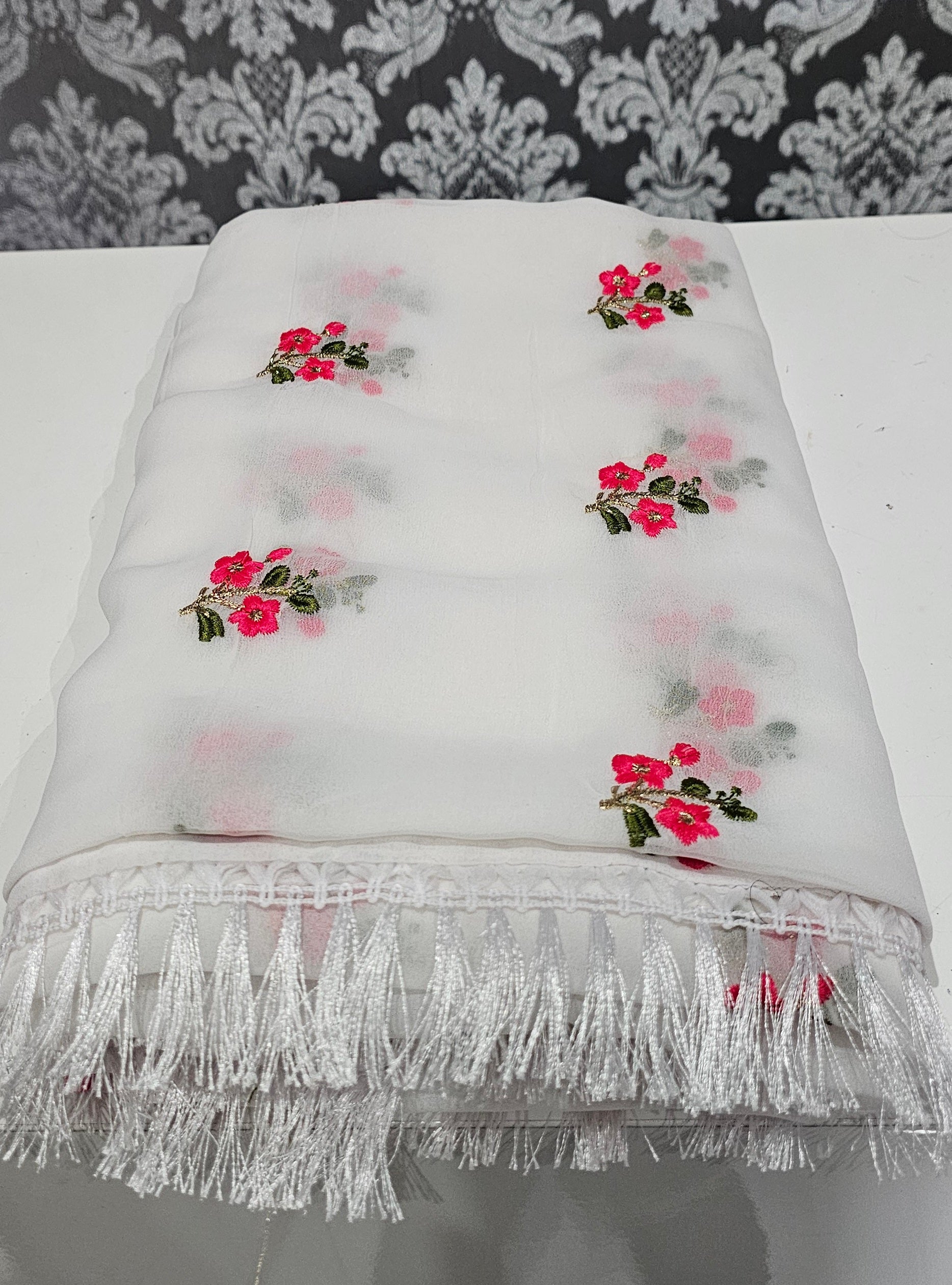 Elevate your ethnic wardrobe with this exquisite faux georgette saree, meticulously embroidered across its entire length. The lightweight fabric drapes beautifully whilst maintaining its shape, making it ideal for both festive occasions and formal events.