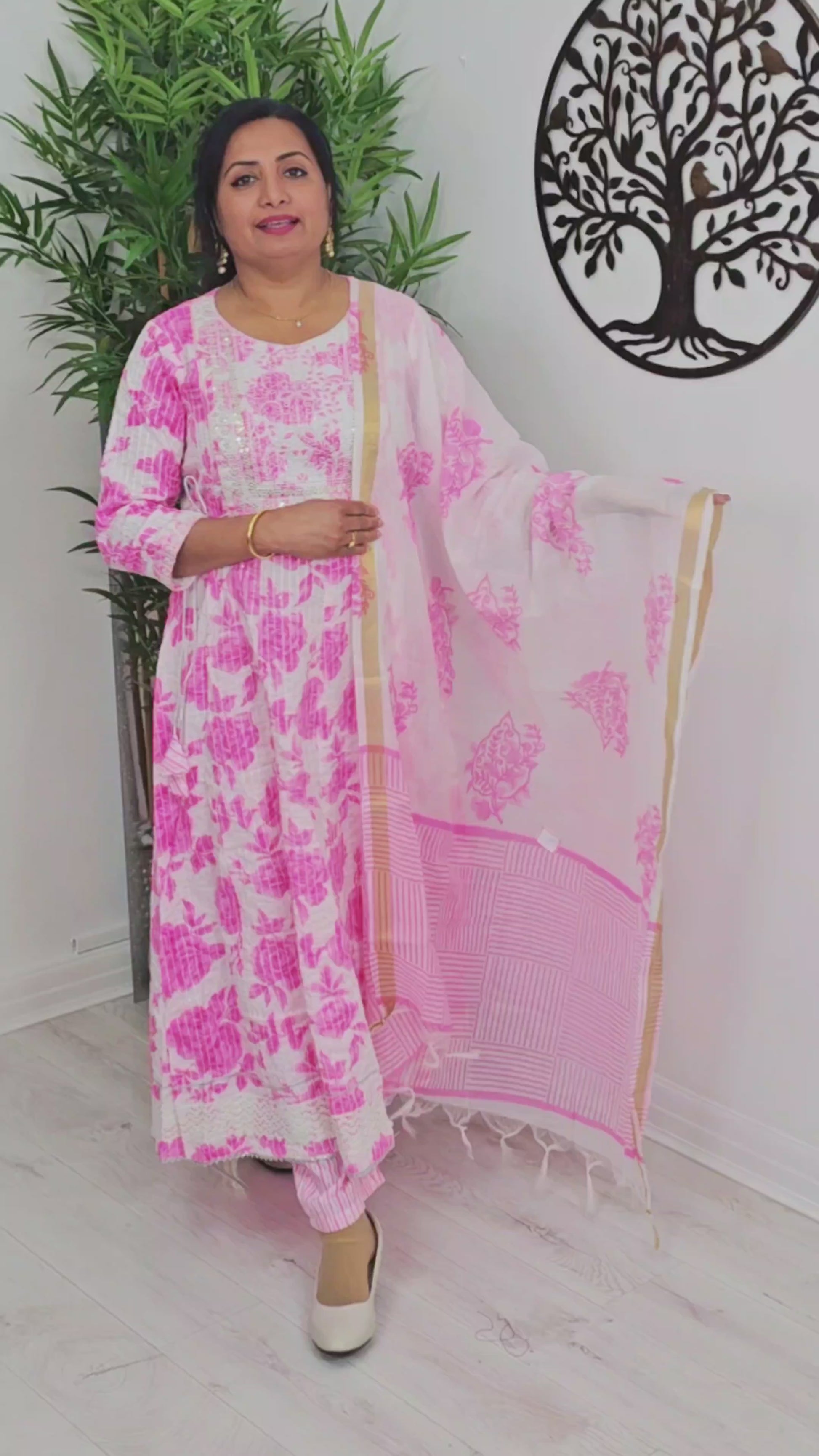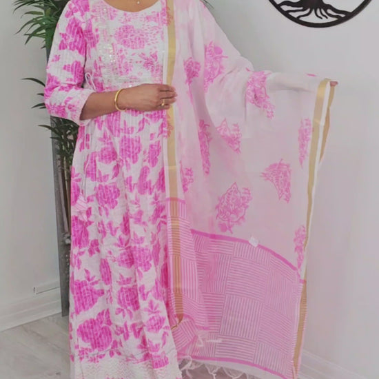 Experience comfort and elegance with this high-quality pure cotton Anarkali suit set. The three-piece ensemble features a beautifully printed floral design that adds a touch of charm, while the breathable fabric keeps you comfortable all day. Perfect for festive occasions or casual gatherings, this suit promises both style and ease. The included dupatta complements the outfit, completing your look with grace.