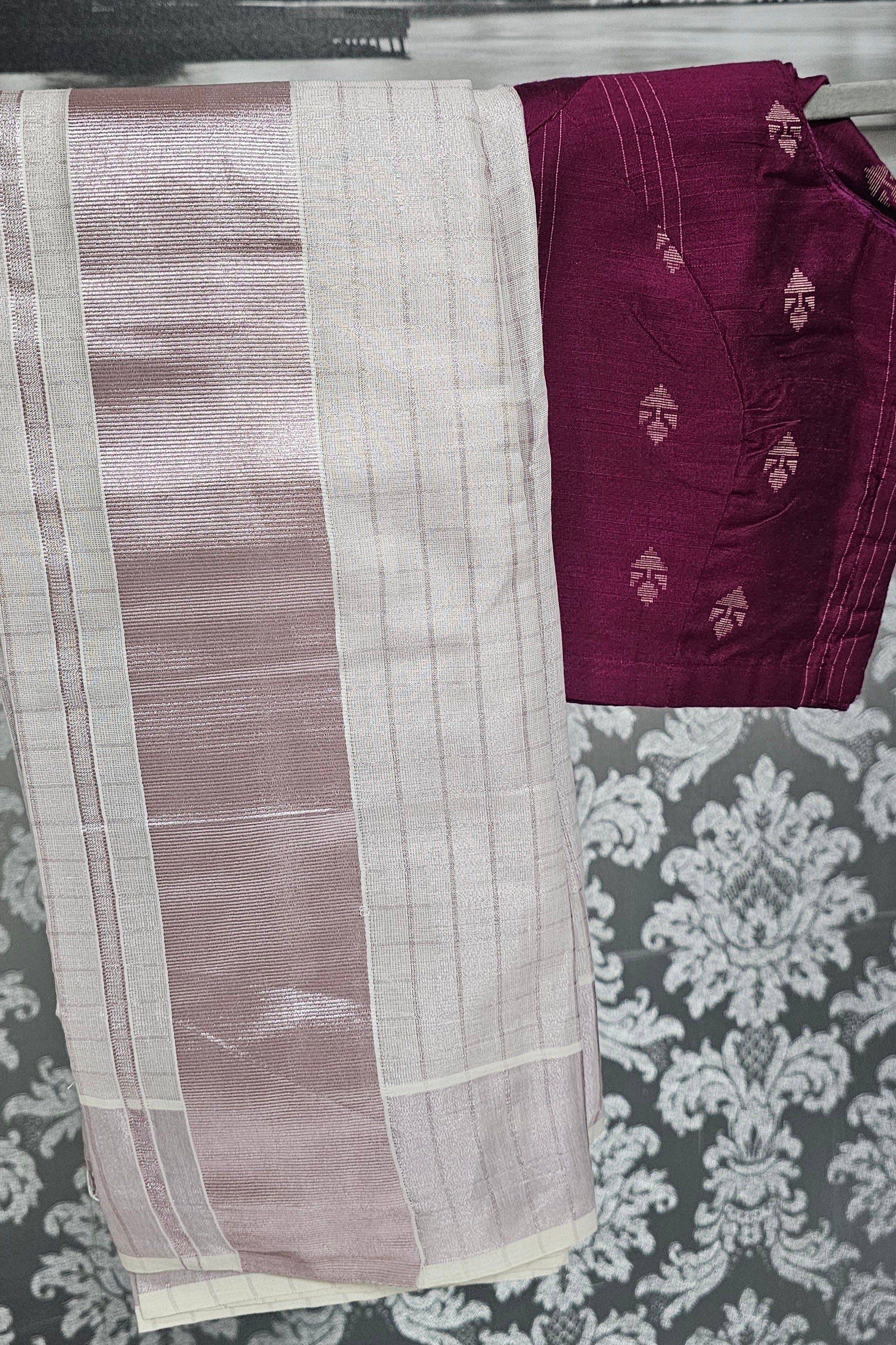 Celebrate Onam with grace in this ready-to-wear lilac saree, designed for effortless elegance. Crafted for comfort and convenience, it perfectly blends traditional charm with modern ease, allowing you to honor the festival without the hassle of draping. The soothing lilac hue adds a subtle yet sophisticated touch to your festive wardrobe. Ideal for those who value both style and practicality during special occasions.