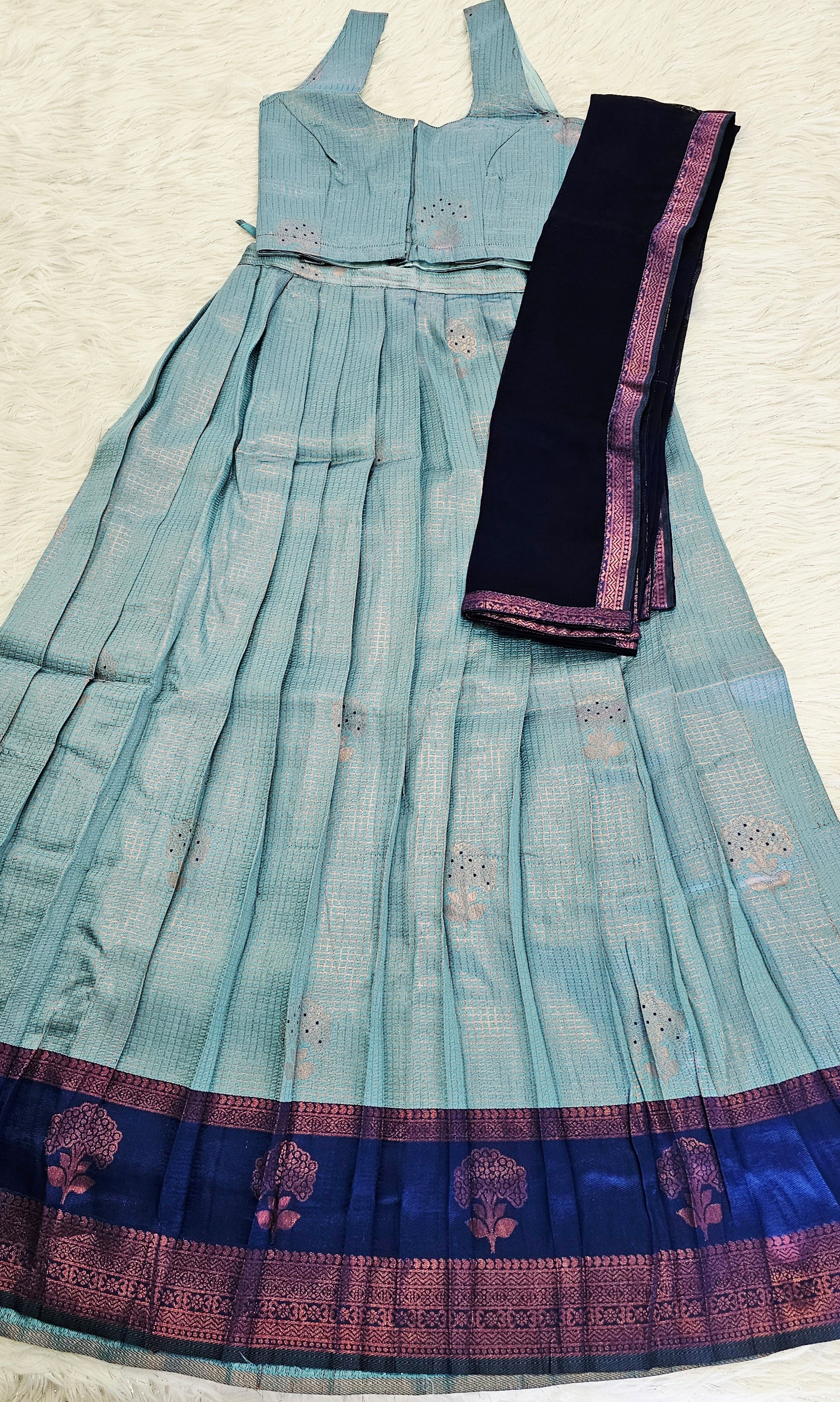 Celebrate Onam with the exquisite Shades of Blue three-piece dhavani set. Crafted to reflect traditional elegance, this ensemble combines a beautifully draped dhavani with matching attire in soothing blue tones. Perfectly suited for festive occasions, it offers both comfort and style, allowing you to honor cultural heritage with grace and sophistication.