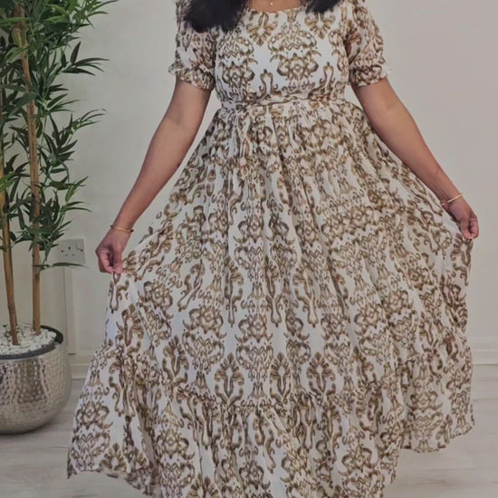 Effortlessly elegant, this chiffon floral dress combines lightweight fabric with a gracefully flared silhouette. The soft chiffon drapes beautifully, creating fluid movement with every step, while the vibrant floral print adds a touch of timeless sophistication. Perfect for garden parties, weddings, or casual summer occasions, this versatile piece transitions seamlessly from day to evening wear. The relaxed fit ensures comfort without compromising on style, making it an essential addition to any wardrobe.