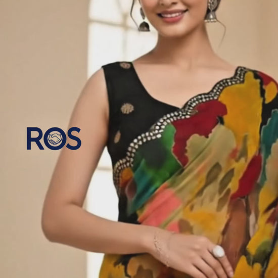 Experience elegance and comfort with this soft chiffon saree featuring delicate scalloped edges. The lightweight, flowing fabric keeps you comfortable all day, while the unique scalloped design adds a subtle, sophisticated touch. Ideal for any occasion where you want to feel graceful and confident. The saree comes complete with a matching blouse piece for a coordinated look.
